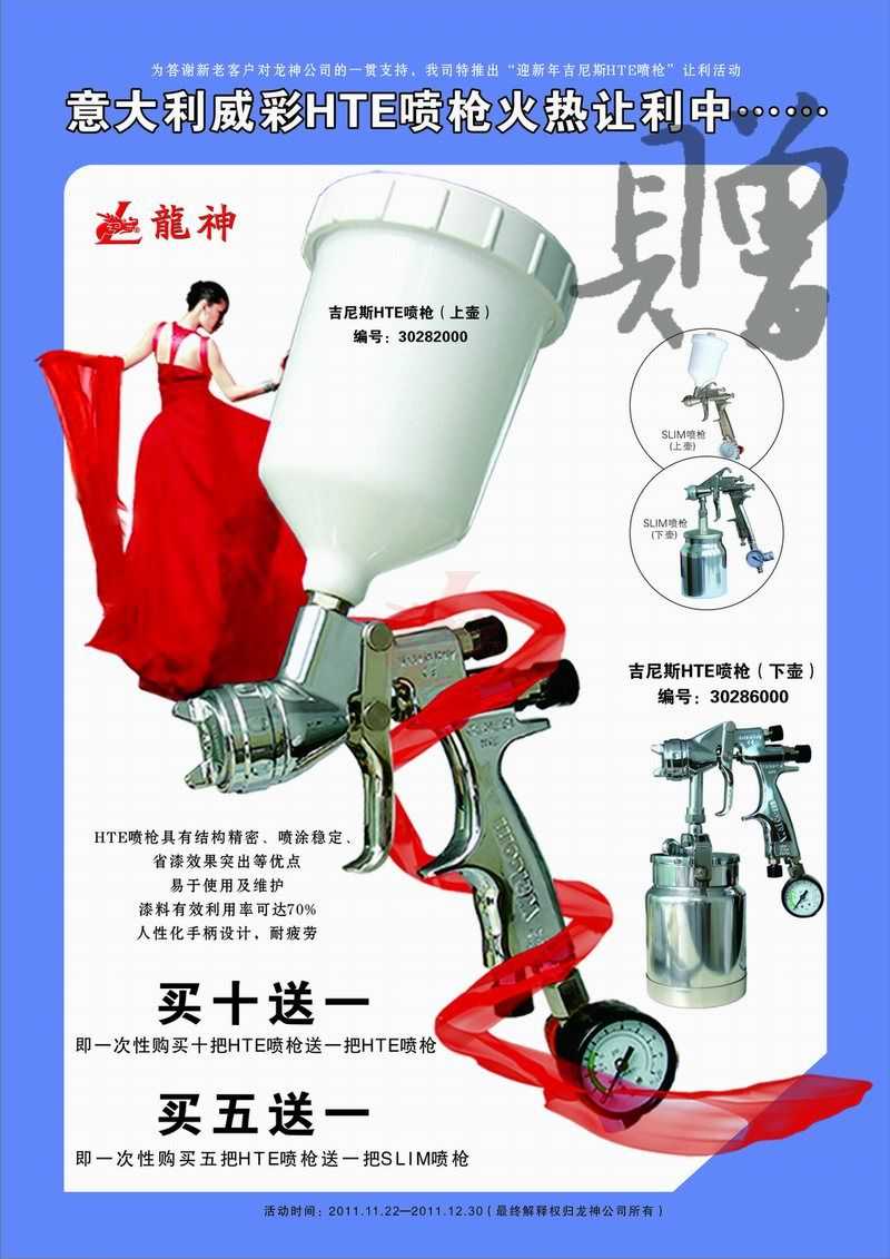 吉尼斯HTE噴槍11月促銷 吉尼斯HTE噴槍2011年11月促銷 (活動已結(jié)束,感謝您的關(guān)注) 一、主題: 吉尼斯HTE噴槍讓利促銷 二、活動目的: 讓利回饋給力促銷 三、活動時(shí)間: 1、 時(shí)間:2011年11月21日至2011年12月30日 2、 時(shí)長:共計(jì)40天 四、活動內(nèi)容: 1、 買十送一(即一次購買十把HTE噴槍送一把HTE噴槍) 2、 買五送一(即一次購買五把HTE噴槍送一把SLIM噴槍) 市場部 2011年11月17日 宣傳海報(bào) 2011-11-19 12949