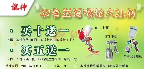 吉尼斯HTE噴槍“初春送?!贝黉N活動(dòng)方案 2013-03-01 28010 吉尼斯HTE噴槍“初春送福”促銷活動(dòng)方案 (產(chǎn)品編號(hào):30282000-30286000) 2013年3月份市場(chǎng)促銷方案如下:一、主題:“初春送?!眹姌尨笞尷6?、活動(dòng)時(shí)間:1、 時(shí)間:2013年03月1日至2013年05月1日 2、 時(shí)長(zhǎng):共計(jì)2個(gè)月 三、活動(dòng)內(nèi)容:1、 買(mǎi)十送一(即一次購(gòu)買(mǎi)十把HTE噴槍送一把HTE噴槍)2、 買(mǎi)五送一(即一次購(gòu)買(mǎi)五把HTE噴槍送一把龍神305噴槍)四、具體操作方案 1、購(gòu)買(mǎi)十把HTE噴槍送一把HTE噴槍 2、買(mǎi)五把HTE噴槍送一把龍神305噴槍 (以上二個(gè)方案具體促銷方式可按增量的形成搭配)