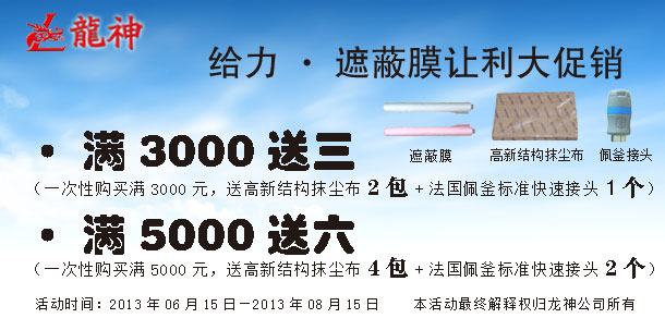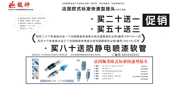法國(guó)佩釜快速接頭“冰夏”讓利大促銷 2013-05-13 18713 法國(guó)佩釜快速接頭促銷方案(產(chǎn)品編號(hào):36102000-36119000)一、主題:“冰夏”促銷行動(dòng) 二、目的:回饋新老客戶,讓利大反饋 三、時(shí)間:1、 啟動(dòng)時(shí)間:2013年5月13日 2、 結(jié)束時(shí)間:2013年7月13日3、 時(shí)長(zhǎng):2個(gè)月 四、活動(dòng)內(nèi)容:1、 買(mǎi)二十送一(即買(mǎi)二十個(gè)快速接頭送一個(gè)法國(guó)佩釜快速接頭或法法國(guó)佩釜吹塵槍(編號(hào):38016)一把) 2、 買(mǎi)五十送三 3、 買(mǎi)八十送防靜電噴漆軟管(編號(hào):36323)五、其它 1、本活動(dòng)最終解釋權(quán)歸珠海龍神所有。